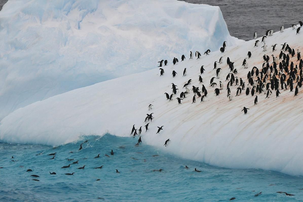南極海峽得名於1902年第一艘航行於南極半島與喬治維爾群島之間水道的探險船。這片水域的景象壯觀震撼,龐大的冰山從拉森冰棚的解體中漂浮而來,仿佛漂浮的巨型雕塑,視覺上充滿衝擊力。