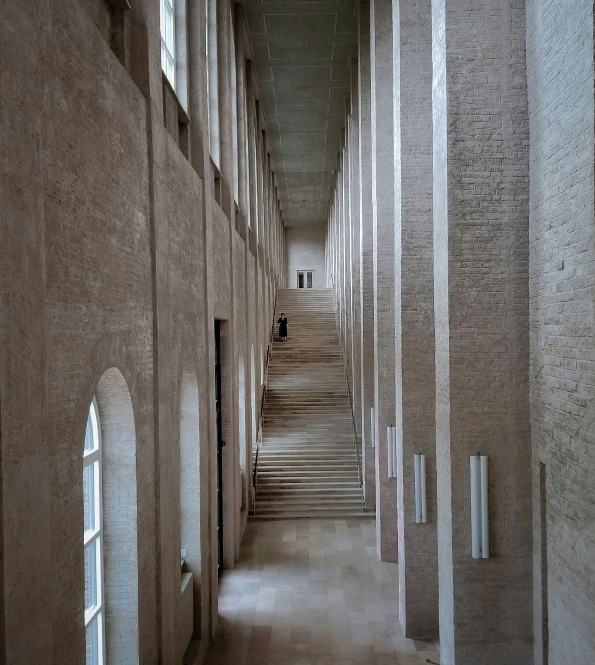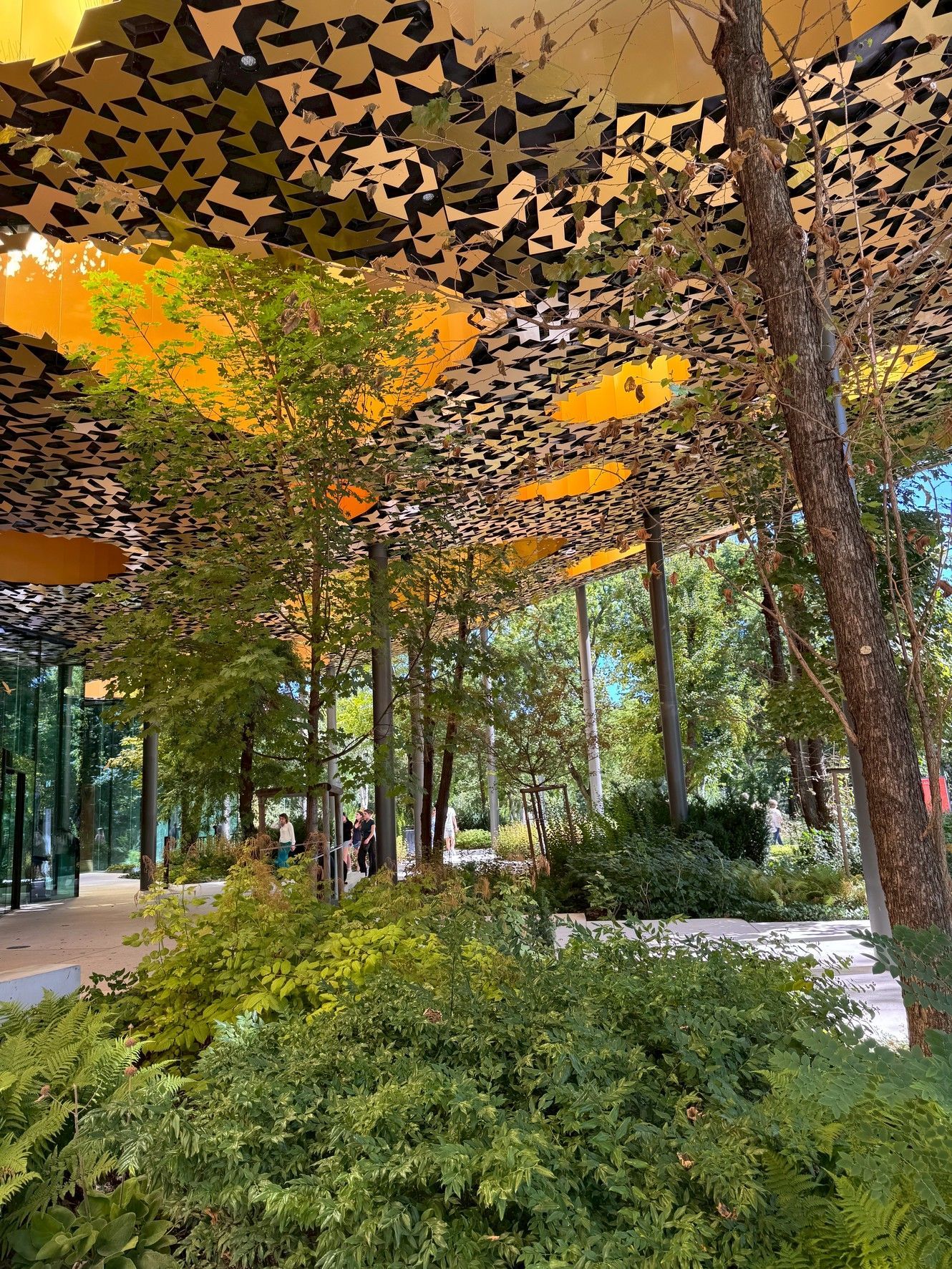 建築設計靈感來自音波與自然的交融,屋頂呈現波浪狀起伏,並設有145個獨特形狀的開口,既是光井也是樹木生長的空間。整體外觀融合玻璃與自然元素,讓室內外界限模糊,營造出與自然共生的氛圍。