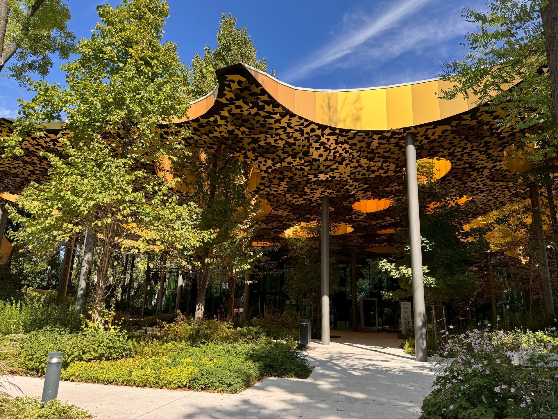 建築設計靈感來自音波與自然的交融,屋頂呈現波浪狀起伏,並設有145個獨特形狀的開口,既是光井也是樹木生長的空間。整體外觀融合玻璃與自然元素,讓室內外界限模糊,營造出與自然共生的氛圍。