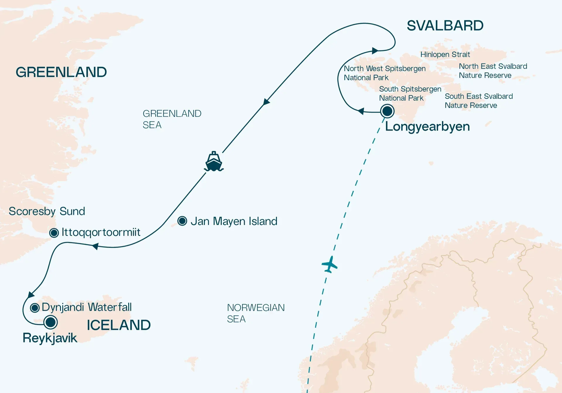 - 包機航班:航程起迄港口的包機接駁 (本航程適用港口:隆雅市 Longyearbyen)。