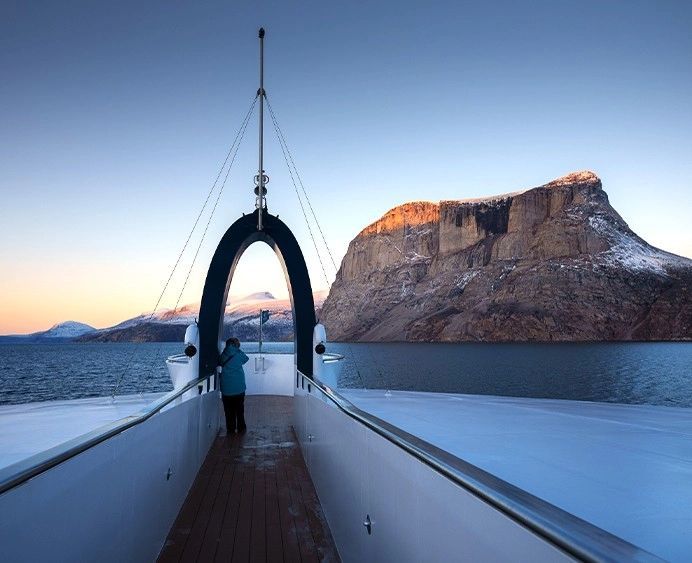 這條長約100公里的狹窄水道,以丹麥國王克里斯蒂安六世命名,兩岸矗立著雄偉的冰川與浮冰,山脈壯麗如畫,宛如極地畫卷。狹窄的峽灣僅限小型郵輪通行,因此得以保留其純淨與寧靜。在穿越峽灣時可細賞原始的極地風光,並有機會邂逅海豹、鯨魚等野生動物,